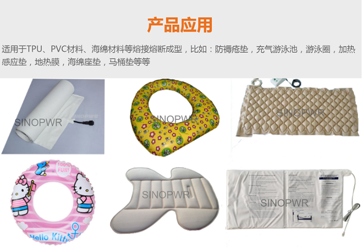救生衣、漂流艇、漂流船、浮排、窗簾、浴簾、充氣水池、游泳池、保健床墊、防褥瘡床墊、玉石床墊、充氣床墊、吹氣沙發(fā)、水囊等; PVC門(mén)墊壓花、門(mén)墊焊接、塑膠門(mén)墊壓花、地毯壓花、腳墊壓花、坐墊壓花、S型腳墊焊接。