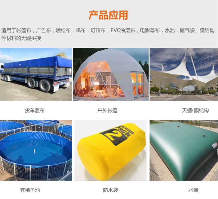專用于PVC涂層布、PA銀膠涂層布、PU銀膠涂層、快速卷簾門、戶外膜結(jié)構(gòu)、遮陽布、廣告噴繪布材料焊接、也可用于軟體沼氣池、沼氣儲(chǔ)氣袋、軟體儲(chǔ)油罐水池等材料的的無縫拼接。